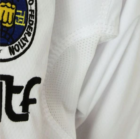 The ITF approved Taekwondo DIAMOND uniform is a premium class traditional cut martial arts gi made of a high-quality, functional Diamond material that is 100% Polyester. This version is a very light-weight cloth with excellent wearing comfort and breathability. Elastic Mesh venting inserts under armpits, as well as in groin area. Traditional cross-over shirt jacket top with Velcro lapel closure, a modern design with vent armpits. Elastic waistband pant bottoms with drawstring and full-length wide gusseted groin for unrestricted kicking.