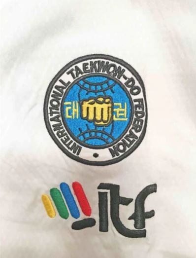 High-quality seams with Red TOP TEN patch on shoulder and embroidery on pants add to the ITF Official insignias to highlight this dobok martial arts outfit making it visually unique while fulfilling requirements of the ITF. ITF Official Patch on top right side of chest with 5 color ITF logos below and semi-circular TAEKWON-DO on back with vertical Korean Hangul characters center. ITF lettering on pants knee area. For training, practice and competition this martial arts gi does it all. Made for adult and teen men and woman as well as youth boys and girls.