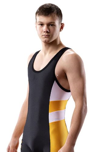 High quality Lycra High Cut Singlet, Black and Gold body, Made in USA, with Eclipse style colored side panels, double sewn throughout with reinforced stress areas, extended leg cut with gripper elastic leg cuffs, all Matman lycra uniforms utilize Matman Moisture Release technology. It wicks the moisture away from the body which aids in cooling, dryness and comfort.