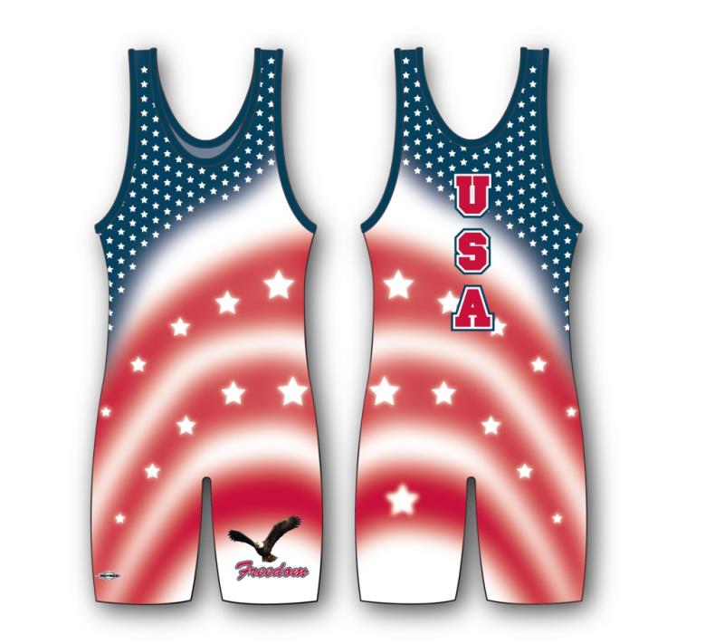 Matman Men’s USA Singlet are Solid Lycra High Cut Wrestling Singlet, double sewn throughout with reinforced stress areas, extended leg cut with gripper elastic leg cuffs, all Matman lycra uniforms utilize Matman Moisture Release technology. Fully sublimated with awesome patriotic USA pattern; Freedom written on the front of left thig; USA on the back. *This singlet is made as orders come in. Please include an extra 3-5 days delivery time. This patriotic Men’s Stars and Stripes grappling singlet is on sale here at the best possible cheap discount online price.