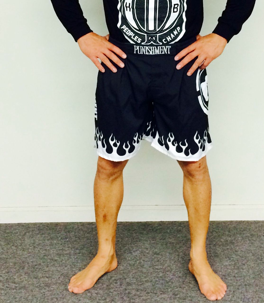 Classic Black and White flamed Punishment Athletics (Tito Ortiz) fight shorts are reinforced for durability, feature a double velcro closure, interior draw string, and elastic expandable waistband. Tito’s Trademark Fist Logo on the side leg with Punishment Athletics on the other. The same MMA combat sports board shorts were worn at Bellator 131. These cool, top rated, comfortable, durable and affordable Punishment Athletics Black & White Flame Mixed Martial Arts and Wrestling Board Shorts are great for training, grappling and on fight day! The Tito Ortiz Black and White flame Punishment Athletic MMA board shorts are on sale here at our mixed martial arts clothing and apparel store at the best possible cheap discount online sales price.