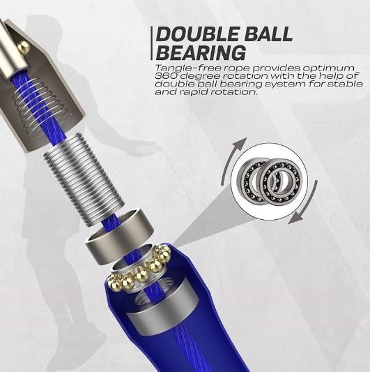 - DOUBLE BALL BEARING – Tangle-free jump rope provides optimum 360-degree rotation with the help of a double ball-bearing system for stable and rapid rotation. It prevents the cable from bending, twisting, or winding so you can avoid hitting snags in your workout. A high-performance metal rope for any home gym setup – facilitating basic jump rope exercises, XFit routines, and boxing training.