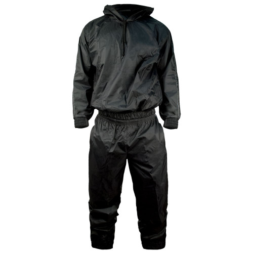 One of the best low cost wrestling, boxing, MMA and other combat sports weight cutting sauna suits with hoodie for sale online today. Featuring a bi-layer rip stop nylon, rubberized nylon liner and elastic waistband and zippered leg cuffs. This high quality sauna suit will help make your weight loss and fat burning workouts even more effective. This top-rated and affordable weight loss workout and sauna heat retention weight burning suit with hood is on sale at our combat sports clothing and apparel store at the best possible cheap discount online sales price.