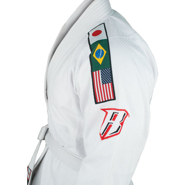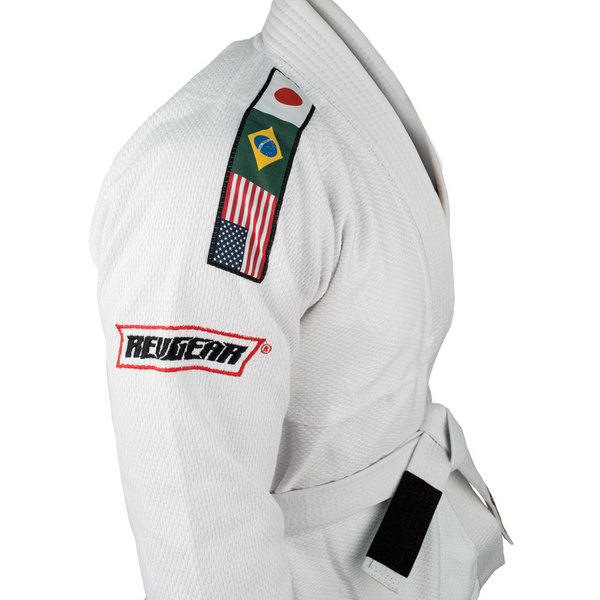 Stand out from the crowd with the Revgear Ultimate Traditional Jiu Jitsu Gi Uniform in White. The single weave, 450gm 100% cotton BJJ Jiu Jitsu gi has no back seams and fully tapered joints with reinforced splits for ultimate durability. This traditional full martial arts gi is both durable and lightweight, perfect for beginners or advanced martial artists and grapplers alike. The white Ultimate Jiu Jitsu Gi has a traditional minimalist design featuring the Revgear brand imagery and flags representing the nations of Japan, Brazil, and the United States. The Revgear Jiu Jitsu Martial Arts Gi is on sale at our martial arts clothing and apparel store at the best possible cheap discount online sales price.