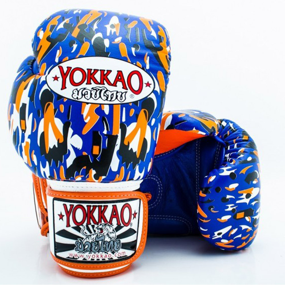 Yokkao Apache Blue Muay Thai boxing gloves with Velcro wrist bands are handmade and are the same gloves used in the best training camps in Thailand. Inspired by the Apache Tribe, Native Americans famed for their tenacity and fighting skills, the Apache Boxing Gloves designed by Yokkao embody the fight spirit. Carry that spirit to your next training session or time in the ring.